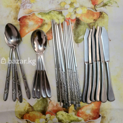 Столовые приборы из нержавеющей стали. Ложки 10 шт, ножи 6 шт, палочки.