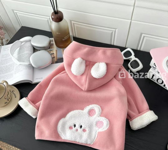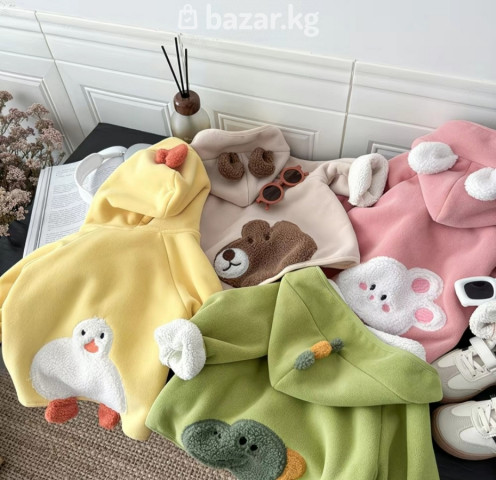 Мягкий, уютный худи из флиса с милой аппликацией. Не колется, хорошо держит тепло, подходит для прогулок и дома.