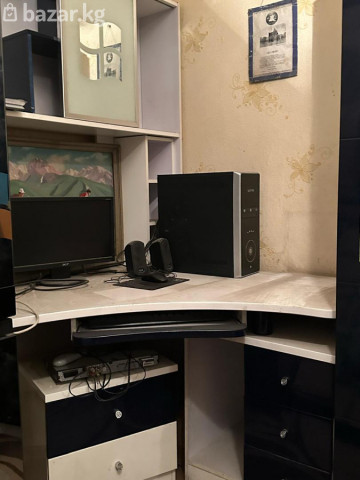 Угловой компьютерный стол с надстройкой и выдвижной полкой под клавиатуру. Особенности и комплектация: - Угловая столешница из светлого материала с закруглённым краем, удобна для установки монитора и системного блока. - Выдвижная полка под клавиатуру по центру. - Нижние тумбы с выдвижными шкафчиками: слева — тумба с 2 ящиками, справа — тумба с 3 ящиками на ручках-пуговках. - Ниша под системный блок/мультимедиа с правой стороны. - Верхняя надстройка с открытыми полками и закрытым отделением со стеклянной/матовой дверцей с зеркальным орнаментом. - Дополнительные открытые полки для книг, документов и аксессуаров. - Подходит для домашнего офиса, учебного места школьника/студента, организации пространства в детской или кабинете. - Цветовая гамма: сочетание белого/молочного и темно-синего глянца, фасады с контрастными вставками. - Кабель-менеджмент: есть ниши и пространство для скрытия проводов. Размеры ориентировочно: - Глубина по сторонам: каждая сторона ~60–70 см - Радиус рабочей зоны ~80–90 см (оценочно по фото; уточняйте по месту) Дополнительно на фото: монитор, системный блок, колонки и периферия — демонстрация возможной компоновки рабочего места.