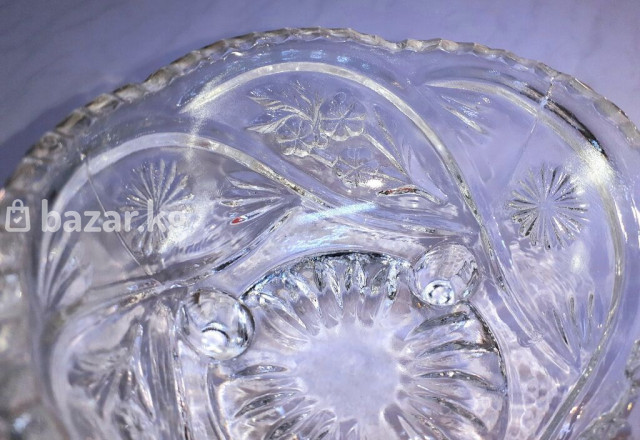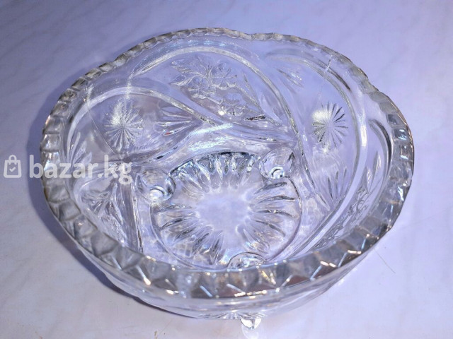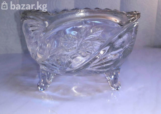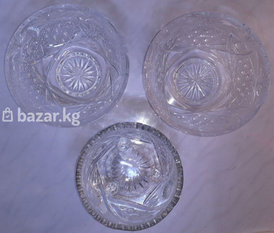 Винтажные вазочки для конфет или варенья, 1980г. СССР. Алмазная резьба. Чешский хрусталь. Ваза на трёх ножках. Высота: 7,3 см. Диаметр: 11,5 см. Толщина: 0,6 см. Состояние: идеальное, ни сколов, ни трещин, ни царапин. 150 сом 2 вазы одинаковые идут комплектом в паре. Высота: 7 см. Диаметр: 13,8 см. Толщина: 0,6 см. Состояние: отличное, в целом ни сколов, ни трещин, ни царапин. 300 сом за 2 шт. За все 3 вазочки - 350 сом.