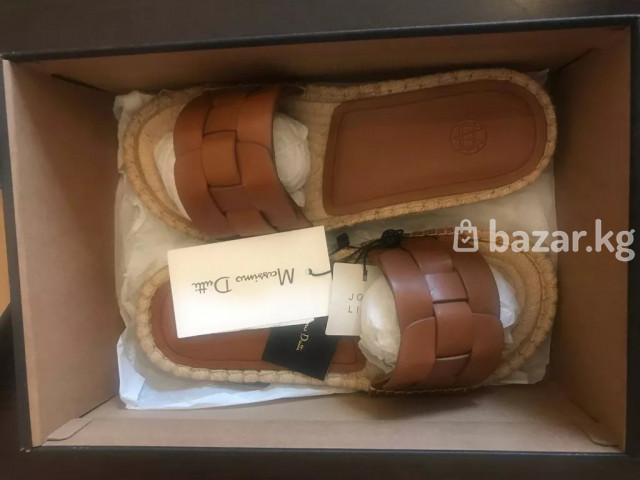 Женские кожаные шлёпанцы-эспадрильи - Верх: переплетённые кожаные ремешки карамельно‑коричневого цвета. - Стелька: гладкая кожаная, с тиснённым логотипом. - Подошва: платформенная основа в стиле эспадрилий с джутовой оплёткой по периметру и прошивкой. - Колодка: широкая комфортная посадка, открытый нос. - Декор: плетение «basket weave», аккуратные швы. - Комплектация: заводские бирки и карточки. Идеальны для лета: устойчивые, мягкая стелька, натуральные материалы, универсальный оттенок сочетается с льном, денимом и хлопком. Подойдут для города и отдыха у моря