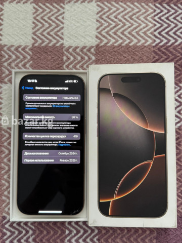 Айфон 16 про в цвете Desert titanium 256 гб, АКБ 90%, имеется коробка и кабель type-c. Пользовались один год, не вскрывался, царапин и сколов не имеется, все свое родное. Продаем в связи с покупкой нового, обмен не рассматриваем, Просим 75к сом, торг уместен. Просьба писать только на вотс ап