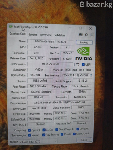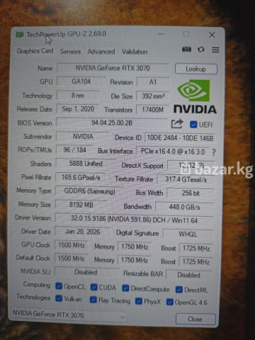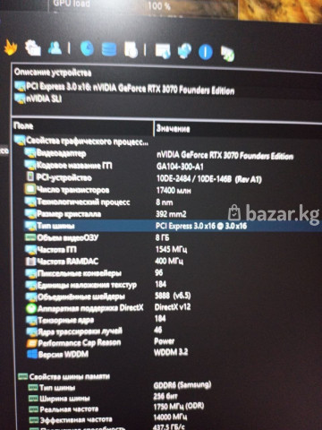 Видеокарта NVIDIA GeForce RTX 3070 Founders Edition GPU: GeForce® RTX 3070 Частота GPU: 1500 МГц Видеопамять: 8 Гб Тип видеопамяти: GDDR6 Разрядность шины видеопамяти: 256 бит Частота видеопамяти: 14000 Мгц Порты: 3 выхода DisplayPort v1.4, HDMI 2.1 Разъем питания: 8 pin+8 pin TDP: 220 Вт 7 дней на проверку Цена 22 000 Cом ✅ Быстрый заказ — WhatsApp ✅ Без выходных 🕒 Ежедневно с 10:00 до 22:00 🚚 Доставка по Кыргызстану: 150 - 350 cом 🌐 Сайт: www.kaufmannservices.pro №946