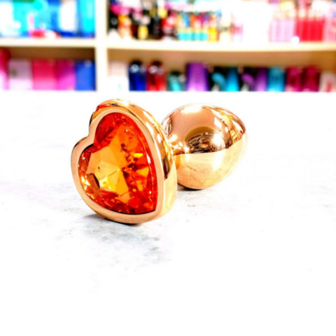 Анальная пробка с оранжевым кристаллом-сердцем (Размер S) Элегантное украшение для ваших самых смелых фантазий. Сочетание благородного золотистого металла и яркого кристалла в форме сердца превращает девайс в настоящее эротическое ювелирное изделие. Размер S: Компактные габариты делают её идеальным выбором для первого знакомства с анальными ласками или комфортного использования в течение вечера.