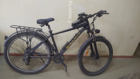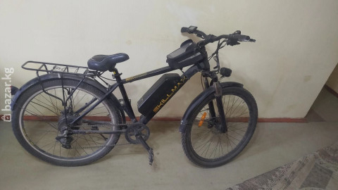 Электровелосипед SkillMax (MTB-формат) Основные характеристики: - Рама: горный тип, стальная/алюминиевая труба с внутренней проводкой, размер под взрослого райдера. - Колёса: 26" с универсальными покрышками для города и грунта. - Привод: многоскоростная трансмиссия с задним переключателем. - Тормоза: ободные V-brake. - Электрооборудование: центрально закреплённый аккумуляторный блок на раме, контроллер и проводка установлены; на руле — дисплей/борткомпьютер с кнопками управления режимами помощи. - Режимы: педалирование с электрической поддержкой и ручной дроссель на руле. - Комплектация: полноразмерные крылья спереди и сзади, багажник над задним колесом, подножка, педали платформы, звонок, светоотражатели. - Руль: установлен сумка-чехол для смартфона/мелочей; грипсы анатомической формы. - Седло: комфортное, с амортизирующим подседельным штырем. - Дополнительно: зарядный порт на батарее, защитный кожух/бокс аккумулятора. Подходит для ежедневных поездок по городу, дач, лёгкого бездорожья и перевозки небольшого груза на багажнике. На дисплее доступна индикация скорости, уровня заряда и режима ассиста.